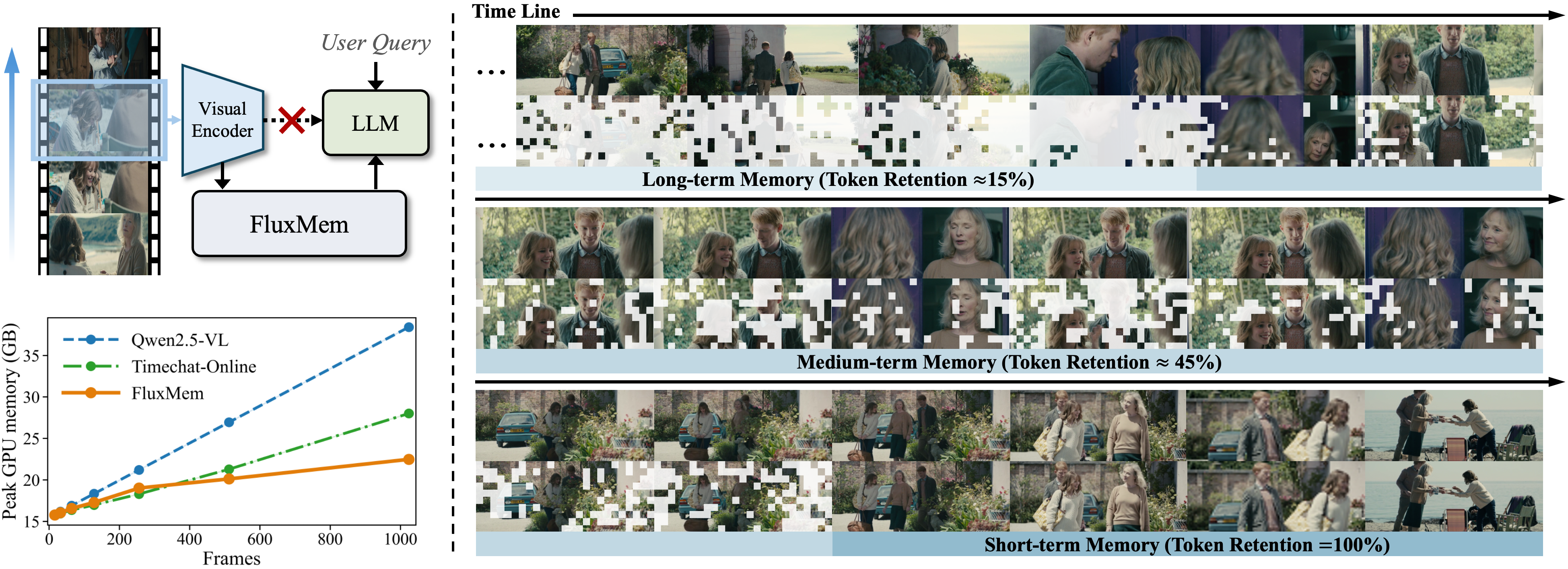 We introduce FluxMem, a training-free framework for efficient streaming video understanding that adaptively compresses redundant visual tokens via temporal and spatial consolidation guided by scene dynamics. FluxMem achieves state-of-the-art performance on online benchmarks while preserving strong offline accuracy with up to 65% fewer visual tokens.
