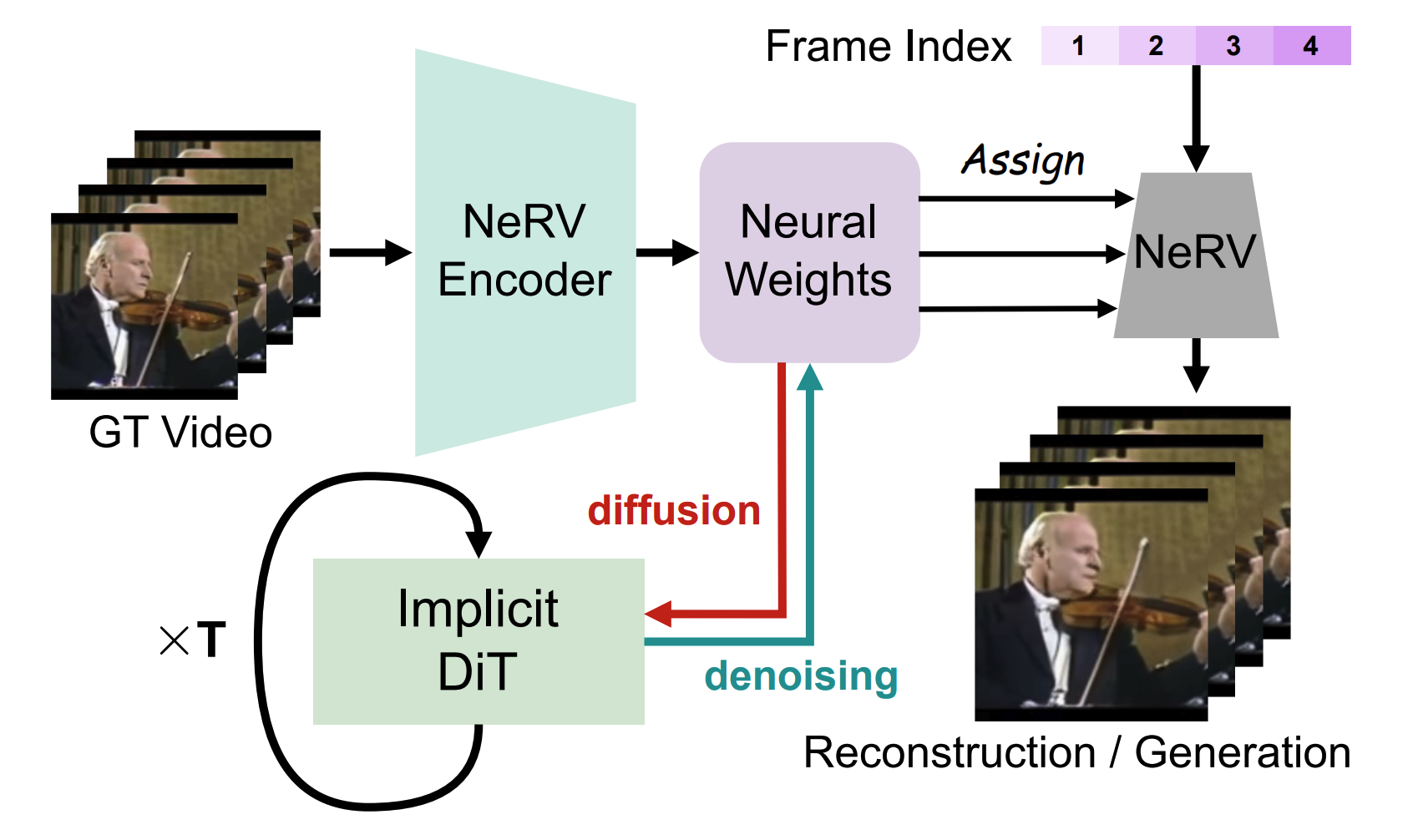 Generate network weights via a diffusion model, which parameterize an implicit neural representation and self-decode to synthesize a video.